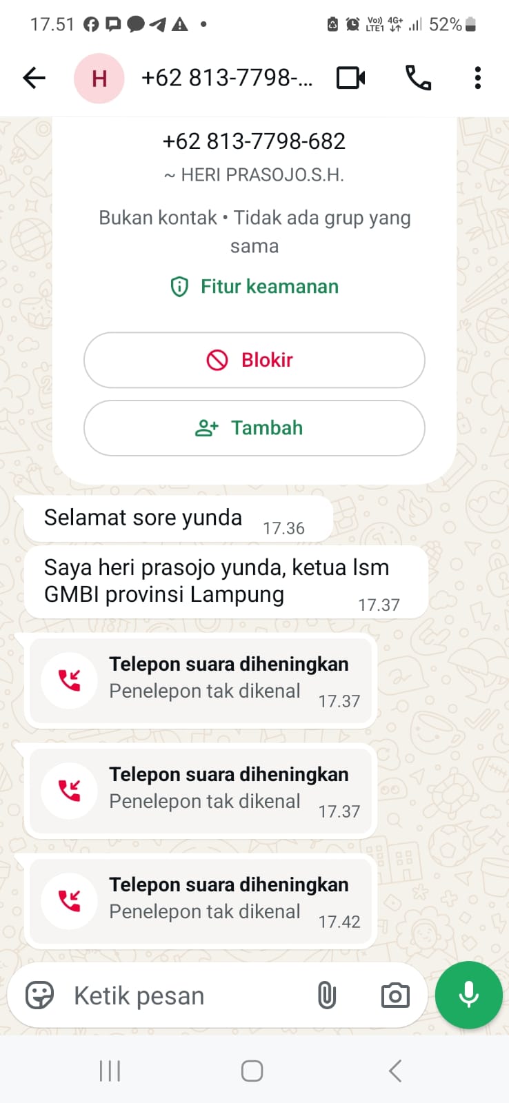 Pesan tersebut diduga berisi komunikasi yang mengarah pada kepentingan tertentu dengan membawa-bawa nama organisasi. Namun, setelah pihak media melakukan klarifikasi langsung kepada Ketua LSM GMBI Wilter Lampung melalui Pesan Singkat WA, dipastikan bahwa nomor tersebut bukan Ketua LSM GMBI Wilter Lampung.