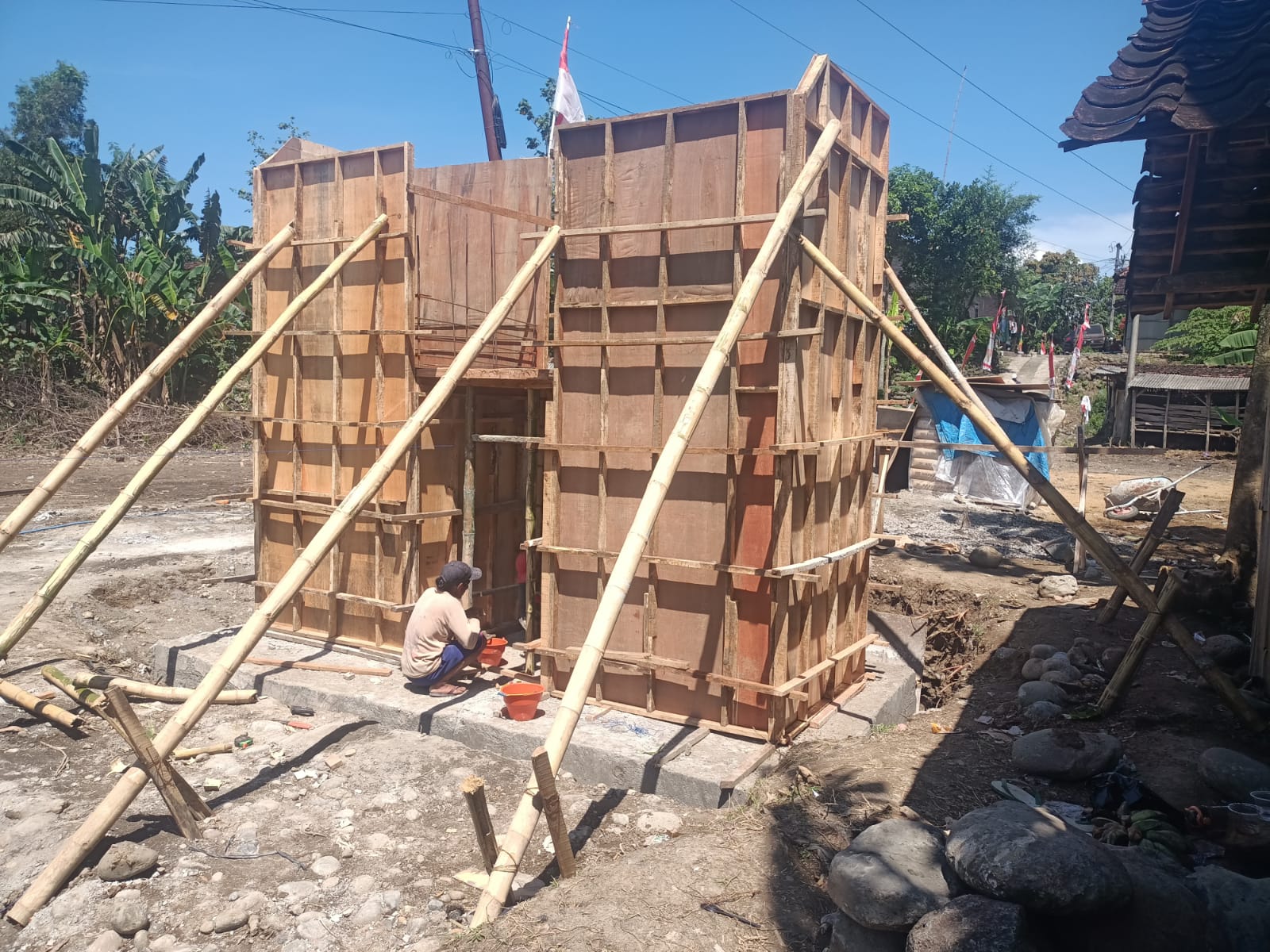 Di lapangan, para pekerja terlihat teliti merakit dan memasang papan bekisting yang diperkuat dengan penyangga bambu. Proses ini dilakukan secara gotong royong dan penuh kehati-hatian, agar hasil pengecoran nantinya dapat maksimal dan sesuai dengan standar konstruksi yang telah direncanakan.