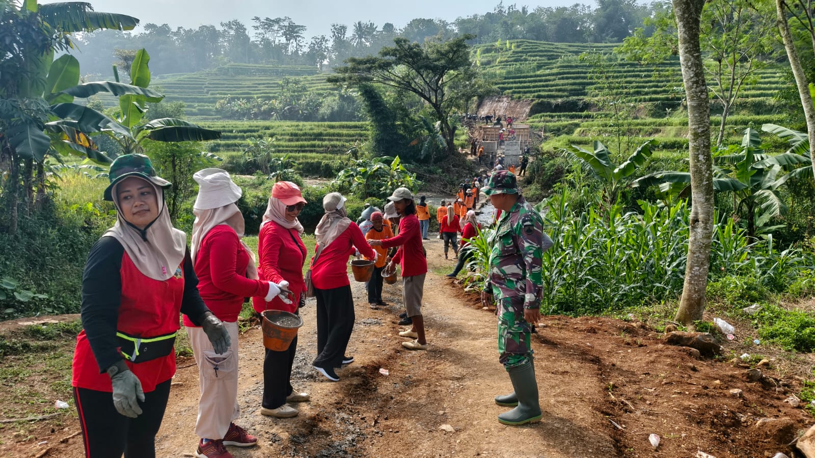 Di tengah hamparan sawah hijau bertingkat, puluhan warga bersama aparat TNI terlihat bahu-membahu menyelesaikan akses vital yang sangat dinantikan masyarakat setempat.